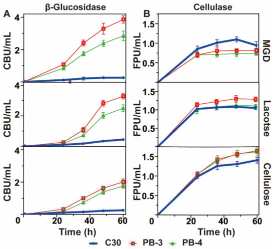 2.2. Production of Cellulase and β-Glucosidase from T. reesei C30, PB3 and PB4