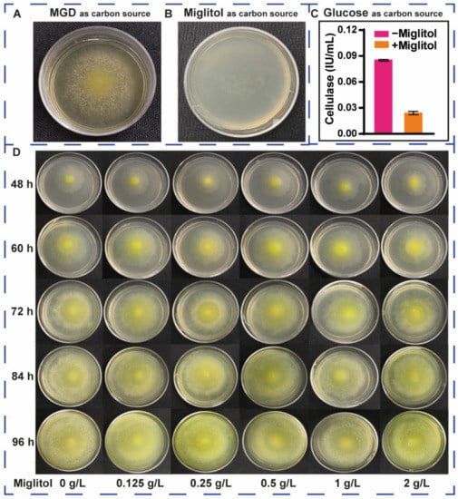 2.5. Effects of Miglitol on the Growth and Cellulase Induction of T. reesei