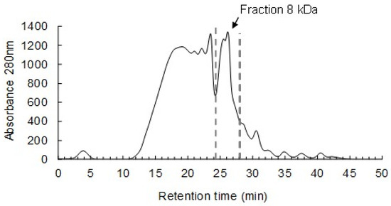 Peptides secreted by S. cerevisiae ER were purified from a 7-day-old fermentation supernatant performed as described in Section 2.3. The cell-free supernatant (filtrated by 0.22 μm Millipore membranes) was first ultra-filtrated through centrifugal filter units (Vivaspin 15R, Sartorius, Göttingen, Germany) equipped with 10 kDa membranes, and then the permeate was concentrated (40-fold) using the same system equipped with 2 kDa membranes. This 2–10 kDa concentrated fraction was then fractionated by gel filtration chromatography using a Superdex-Peptides 10/300 GL column (GE Healthcare, London, UK) coupled to an HPLC system equipped with a UV detector (Merck Hitachi, Darmstadt, Germany). A total of 200 µL of fraction were eluted with ammonium acetate 0.1 M at a flow rate of 0.7 mL/min, and fraction 8 kDa indicated in Figure 1 was collected into a 2 mL Eppendorf, freeze-dried and lyophilized.