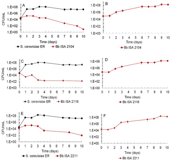 Culturability of S. cerevisiae ER and B. bruxellensis was determined during alcoholic fermentations performed with six B. bruxellensis strains, i.e., ISA 1649, ISA 1700, ISA 1791 (Figure 2) and ISA 2104, ISA 2116, ISA 2211(Figure 3), in mixed-culture with S. cerevisiae ER (panels A,C,E) and in single-culture (panels B,D,F). In both mixed- and single-culture fermentations, the medium was inoculated with 5 × 104 cells/mL of each yeast strain and incubated at 30 °C. Single-culture fermentations of B. bruxellensis strains were used as a negative control of the antagonistic effect exerted by S. cerevisiae.