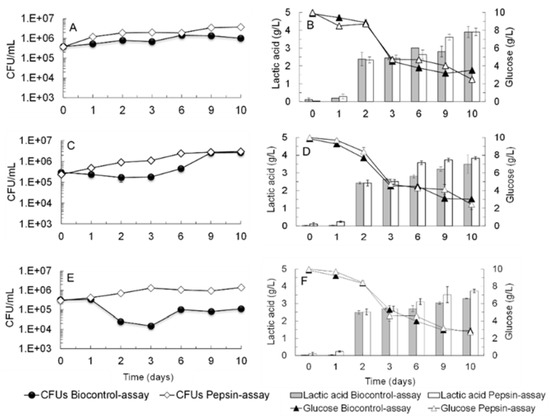 Culturability (A,C,E), glucose consumption and lactic acid production (B,D,F) during growth assays performed with L. brevis (A,B), L. hilgardii (C,D) and L. plantarum (E,F), inoculated in a cell-free supernatant pre-fermented by S. cerevisiae ER without any treatment (biocontrol assay) and after a pepsin treatment (pepsin assay). Data represented correspond to means ± SD (error bars) of two independent biological assays.