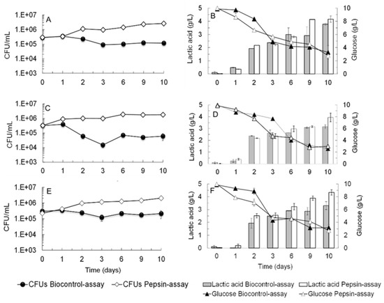 The proliferation of LAB in fuel-ethanol fermentations can decrease ethanol levels and yields due to sugar consumption and accumulation of by-products such as lactic acid in the medium, which may affect S. cerevisiae metabolism resulting in sluggish fermentations [13,14,15]. Since, in previous work, we demonstrated that several S. cerevisiae wine strains secrete AMPs during alcoholic fermentation that inhibit the growth of some LAB, namely of Oenococcus oeni strains [36,37], in the present study, we performed growth assays with six LAB species in a cell-free supernatant pre-fermented by S. cerevisiae ER (biocontrol assays). As a negative control of the antagonistic effect exerted by the AMPs secreted by S. cerevisiae ER against these LAB, the same cell-free supernatant was treated with pepsin (pepsin assay) to inactivate the AMPs. Both cell-free supernatants were supplemented with glucose and malic acid to evaluate glucose consumption and lactic acid production in the presence (biocontrol assay) and in the absence (pepsin assay) of the AMPs. Figure 4 and Figure 5 show the culturability (panels A,C,E), glucose consumption, and lactic acid production (panels B,D,F) profiles of Levilactobacillus brevis ISA 4385; Lentilactobacillus hilgardii ISA 4387; Lactiplantibacillus plantarum ISA 4395 (Figure 4) and Leuconostoc mesenteroides subsp. cremoris ISA 4383, Pediococcus parvulus, and Pediococcus pentosaceus (Figure 5) during the biocontrol assays and pepsin assays.