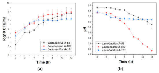 (a) Growth curve of selected lactic-acid bacteria inoculated in MRS broth. (b) pH reduction of skim milk during fermentation through selected lactic acid bacteria inoculation.