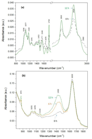 Evaluation of fermentation performance of selected strains over time by FTIR (a) Leuconostoc A-100 strain (changes at 1730, 1670, 2920, and 2850 cm−1 due to lactic acid accumulation); and (b) Lactobacillus A-53 strain (changes in the amide III region at 873 cm−1, 1035 cm−1, 1078 cm−1, and 1154 cm−1 due to free amino acids formation; and in the amide I and II regions at 1450 cm−1 and 1650 cm−1).