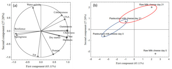 Principal component analysis (PCA) was used to assess pattern recognition between attributes and the use of cultured pasteurized milk in Adobera cheesemaking (Figure 4). Two principal components (PC) were enough to explain 90% of the total variance (PC1: 63.11% and PC2: 27.26%). Circle correlations plot (Figure 4a) shows the association that may exist between the different attributes of cheese. Selected attributes of the TPA analysis (hardness, cohesiveness, and chewiness) and color (expressed as °hue) of cheese may be positively correlated to FAA and protein content but less linked to water activity and fat content, since cheeses did not exhibit syneresis or dehydration during storage as usually occurs in ripened cheeses, which induced an increase in the concentration of fat and other components of cheese and, as a consequence, change in instrumental color [61]. Other milk components (including water- and fat-soluble) and changes induced on these by processes affect cheese color are vitamins and carotenoids [59]. Through location graph (Figure 4b), representing the product of PCA performed on the table of average scores, it is possible to infer that PMCs showed different compositional and texture profiles at day 0 post-manufacturing. Textural and color profile of PMCs approached to RMCs at day-21, possibly associated with extended proteolysis in PMCs that transform casein into a more soluble state that induced modification in cheese protein matrix and color, as observed in matured cheeses during ripening process [62,63].
