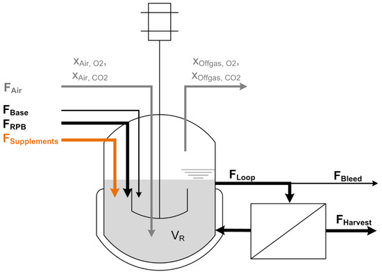 where FFeed is the sum of input flows FRPB, FSupplements, and FBase; FRPB is the RPB feed flow rate; FSupplements is the supplement feed flow; FBase is the flow of the base; and VR is the bioreactor volume. The dilution rate D can also be denoted as the reciprocal value of The Hydraulic Residence Time (HRT). The retention rate R is calculated based on flows of the RPB feed FFeed and the cell-free harvest FHarvest. Once steady-state conditions are reached, the growth rate µ of the microbial system can be calculated based on the retention rate R and the dilution rate D (Equation (5)).