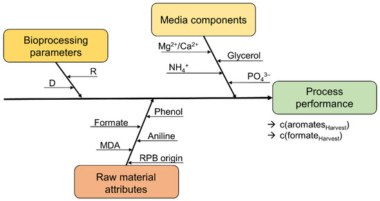 During the production of MDA, process conditions might be varied, which ultimately leads to changes in organic impurity concentrations between different RPB batches. However, the effects of such changes in the raw material attributes (RMA), such as the organic impurity concentrations on the degradation efficiency of the investigated biological treatment process, are not known. Still, the degradation efficiency of organic contaminants is one major process performance variable, if the RPB shall serve as a raw material for a chlor-alkali-electrolysis step. Besides RMA, other critical process parameters such as bioprocessing parameters (dilution rate, retention rate, or biomass concentration) and media components (different nutrient concentrations) might also influence the process performance.