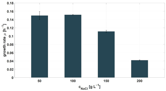 In previously performed shake-flask experiments, the potential effects of the RPB origin on the microbial growth rate and the degradation efficiency of organic impurities were investigated. Shake-flask experiments showed no differences in the specific growth rates and organic degradation efficiency for medium prepared from RPB1, 2, and 3 (data not shown). As previously reported, potential changes in the NaCl concentration in the RPB might occur and influence microbial growth rates [16]. Therefore, specific growth rates of the novel halophilic mixed culture at different NaCl concentrations were determined in shake flasks (Figure 3). The growth rates stayed constant at NaCl concentrations between 50 and 100 g L−1, whereas a decline in the growth rates was observed at NaCl contractions of 150 and 200 g L−1. Hence, NaCl concentrations for the different RPB origins were determined (RPB1: 100.1 ± 0.6 g L−1, RPB2: 83.0 ± 0.6 g L−1, RPB3: 82.9 ± 0.7 g L−1). In conclusion, the determined growth rates indicated that the halophilic mixed culture is suitable for growth in the RPB as the NaCl concentration was measured between 80 and 100 g L−1. NaCl concentrations higher than 100 g L−1 lower the growth rate to 0.04 h−1 at 200 g L−1. Furthermore, the results of the bioreactor cultivation experiments indicated no influence of the RPB origin on the degradation efficiency of formate or aromatic compounds.