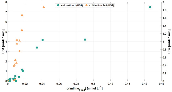 Accumulation of US1+2 depending on RPB feed concentrations of aniline (●: peak area of unknown substance 1, found during cultivation experiment 1; ▲: peak area of unknown substance 2, found during cultivation experiments 2 + 3).