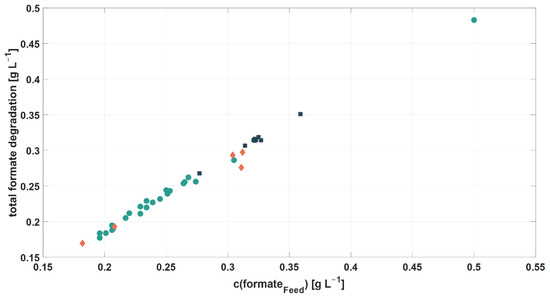 It was shown that the total amount of degraded formate and the formate concentration in the RPB feed were linearly correlated (Figure 5). This linear trend was consistent within all three cultivation experiments. Nevertheless, formate was not completely degraded, as residual formate was still measured in harvest samples (2–11% of the original formate concentration). However, residual formate concentrations could not be linked to the corresponding formate concentration in the RPB feed. Therefore, further investigations of influential factors on formate degradation were carried out (see Section 3.3.2).