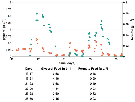 Process performance for cultivation 1 during the second experimental phase. Concentration of glycerol (●) and formate (■) in harvest samples. The table gives information about the corresponding feed concentrations [16].