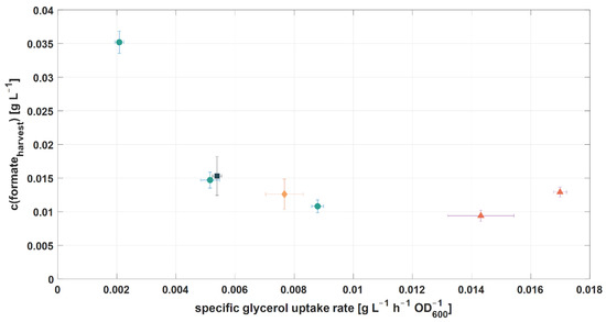 An optimal control space for the specific glycerol uptake rate could, therefore, be located at 8.0–16.0 × 10−3 g L−1 h−1 OD600−1, where the lowest c(formateHarvest) (~10 mg L−1) was reached (see Figure 7). Similar values for the specific glycerol uptake rates were tested in other studies (10.2 × 10−3 g L−1 h−1 OD600−1 [13] and 11.6 × 10−3 g L−1 h−1 OD600−1 [56]) using H. mediterranei. However, in these studies, no effect on the influence of the specific glycerol uptake rate on c(formateHarvest) was reported. Specific glycerol uptake rates below 8.0 × 10−3 g L−1 h−1 OD600−1 led to an increase in c(formateHarvest). This is also in line with other studies, which investigated low growth rates of bacteria in retentostats and observed the co-utilization of substrates which are not co-utilized during carbon excess [54,55,57,58]. In contrast, higher specific glycerol uptake rates could not increase formate degradation, but would result in higher process costs due to a higher glycerol consumption. Moreover, it was shown, in cultivation 1, that an excess of the carbon source glycerol led to decreased formate degradation.