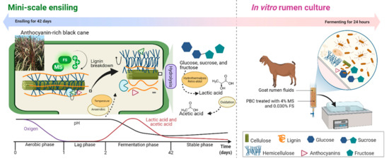 A noble cane, anthocyanin-rich black cane (aBC; Saccharum sinensis Robx.) is a complex interspecific hybrid between Saccharum spontaneum and Saccharum officinarum, a strong-growing species of grass (Poaceae) native to mainland South Asia [1]. Although it has harder stalks than sugarcane (S. officinarum), aBC was generally used for sugar production due to its high sucrose content. In recent years, in Thailand, aBC has been recognized for its rapid growth, high fiber content, and abundance of anthocyanin. Despite the availability of energy and protein content, all of these are strong reasons to cultivate aBC and consider it as a potential source of roughage supplementation for ruminant animals. The functional properties of anthocyanin as a beneficial coloring compound have been explored in livestock; it modulates the alleviation of heat stress, accelerates antioxidant activity, and stimulates the rumen microbiome [2,3,4]. Therefore, it has a potential to improve rumen-derived products, such as milk and meat. However, feedback from farmers indicates that feeding aBC alone could not completely meet the production requirements of ruminants because of the poor palatability of anthocyanin and low dry matter intake. Typically, plant anthocyanin has a bitter taste, and sinensis species also have a high content of lignocellulosic components [5]. This has a superior effect on the non-structural carbohydrate and degrades the structural carbohydrate during rumen digestion [6]. Therefore, most farmers do not utilize or treat it. Thus, it is left in the field to decompose or is burned in the open, leading to significant environmental impacts. Given that such agricultural activities pose a significant problem in terms of disposal, ensiling has been proposed as an effective method of preserving roughage; however, it necessitates a suitable effort prior to ensiling because biomass breakdown during anaerobic fermentation results in functional microorganisms and chemicals that reduce nutrition loss as well as harmful substances.