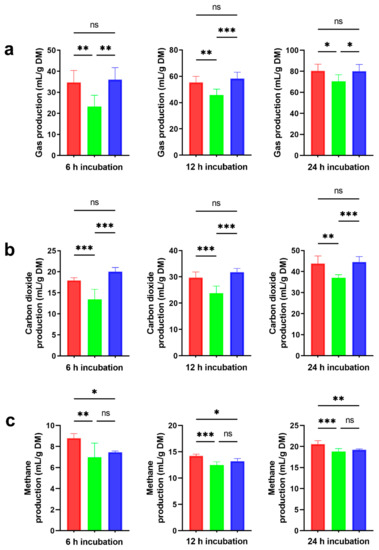 ), at three time points (6, 12, 24 h) during in vitro rumen incubation: (a) total gas production; (b) carbon dioxide production; (c) methane production. The values shown are the means, with standard errors represented by vertical bars. Significantly different values are indicated as follows: *, p < 0.05; **, p < 0.01; ***, p < 0.001; ns, p > 0.05.