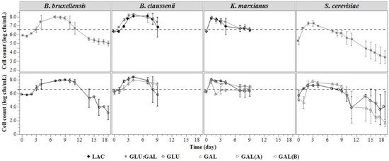 | K. marxianus | Day 0 | 0.102 ± 0.002 | 0.106 ± 0.004 | 0.108 ± 0.001 | 0.109 ± 0.001 |