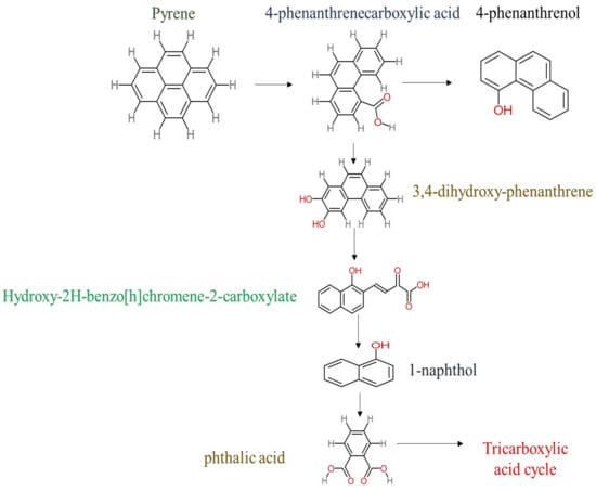 - Phenantharene-4,5-dicarboxylic acid, dihydroxy pyrene, phenanthrene-4-carboxylic acid, phthalic acid, and pyrene-4,5-dihydrodiol were the most frequent metabolites that were detected when Mycobacterium sp. strains were used for pyrene degradation.