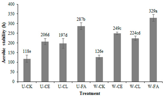 Effect of additives on the aerobic stability (h) of paper mulberry silage after 60 days of ensiling (SEM = 14.47, p < 0.001). Vertical bars are the standard errors of the means, bars with different letters differ (p < 0.05). a–e: Values shown in different letters in the same column are statistically important (p < 0.05). Treatment: U, wilt 0 h; W, wilt 3.5 h; CK, control (no additives); CL, Enterococcus durans; CE, cellulase; and FA, formic acid.