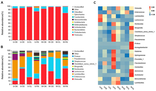 Relative abundances of bacterial communities at the levels of phylum (A) and genera (B). Correlation analysis of the bacterial genus with the different treatments (C). U, wilt 0 h; W, wilt 3.5 h; CK, control (no additives); CL, Enterococcus durans; CE, cellulase; and FA, formic acid.