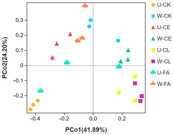 Principal co-ordinates analysis (PCoA) and ANOSIM analysis of B. papyrifera silages. U, wilt 0 h; W, wilt 3.5 h; CK, control (no additives); CL, Enterococcus durans; CE, cellulase; and FA, formic acid. The distance between treatments represents the degree of bacterial community difference, and the closer the distance, the more similar the difference.