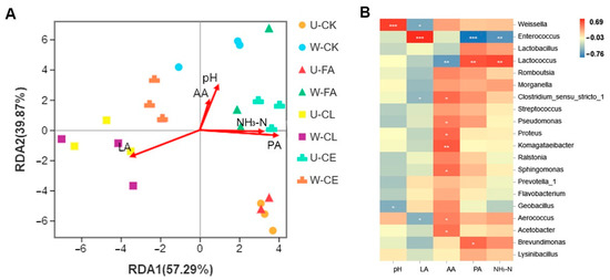 Correlation between different treatment groups and between community composition. (A) Distance-based-redundancy analysis (RDA)-forwsel analysis of microbial community composition and fermentation characteristics. (B) Relationships of fermentation characteristics with silage bacterial community at the genus level. Positive correlations are shown in red, and negative correlations are shown in blue. “*, **, and ***” represent p < 0.05, p < 0.01, and p < 0.001, respectively. U, wilt 0 h; W, wilt 3.5 h; CK, control (no additives); CL, Enterococcus durans; CE, cellulase; FA, formic acid; LA, lactic acid; AA, acetic acid; PA, propanoic acid; and NH3-N, ammonia-N.