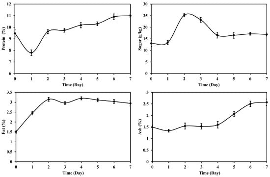 Based on the optimal fermentation conditions of DDGS fermented by A. niger, the changes in main nutrients in the whole fermentation process were analyzed to further observe the characteristics of nutritional transformation. The total content changes of protein, fat, carbohydrate, and ash in DDGS during fermentation with A. niger were analyzed. As shown in Figure 1, A. niger significantly changed the content of major nutrients in DDGS. At the beginning of fermentation, A. niger consumed part of the protein in DDGS as it grew. The total content of protein in DDGS significantly decreased within the first day of fermentation. From the second day, the protein content in DDGS gradually increased until the end of fermentation. It indicated that A. niger consumed the protein in DDGS at a slower rate than the protein it produced itself. Compared with unfermented DDGS, the protein in DDGS at the end of fermentation increased from 9.5% to 11%. After fermentation by A. niger, the improved crude protein concentration could be due to the degradation of complex fiber forms with the protein, with no extraneous nitrogen source added []. Similar protein improvement by fermentation was also reported on fermented wet distiller grains with solubles by Rhizopus oryzae [].