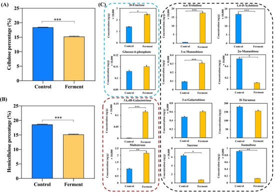 The content of hemicellulose, cellulose, monosaccharides, disaccharides, and trisaccharides in DDGS before and after fermentation with Aspergillus niger. (A) The change of cellulose content; (B) The change of hemicellulose content; (C) The change of monosaccharides, disaccharides, and trisaccharides. Monosaccharides in the blue box; disaccharides in the black box; trisaccharides in the red box. * represents p < 0.05; ** represents p < 0.01; *** represents p < 0.001.