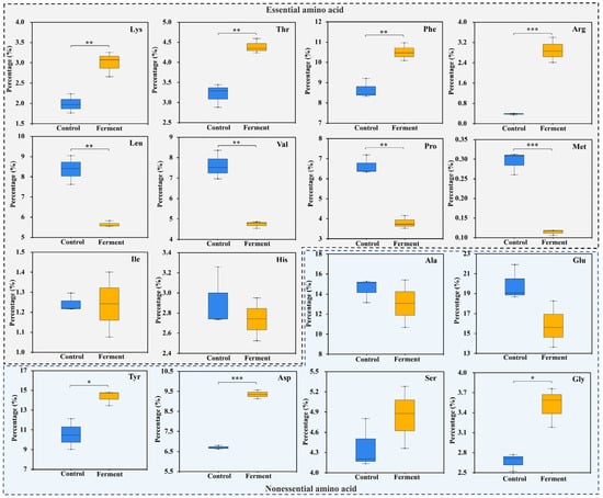 Different amino acid composition ratio of DDGS before and after fermentation with Aspergillus niger. The amino acids in the gray area are essential amino acids for pig growth while the non-essential amino acids in the blue area. * represents p < 0.05; ** represents p < 0.01; *** represents p < 0.001.