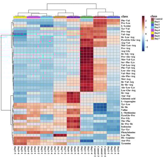 The heatmap of main amino acids and short peptides produced by Aspergillus niger during fermenting DDGS. The compounds shown in the heatmap were screened with VIP > 1.0.