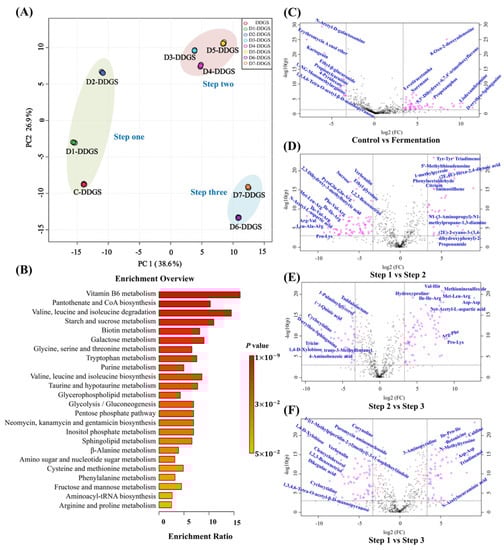 Statistical analysis of metabolites produced in DDGS fermentation process with Aspergillus niger. (A) PLS-DA score plot for the fermentation process; (B) Enrichment overview of metabolic pathways; (C) Volcano plot of metabolites in DDGS before and after fermentation; (D) Volcano plot of metabolites in DDGS of step 1 and step 2; (E) Volcano plot of metabolites in DDGS of step 2 and step 3; (F) Volcano plot of metabolites in DDGS of step 1 and step 3.