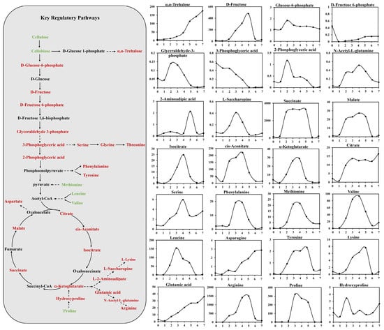 Based on the above, the content changes of related compounds in key regulatory pathways during DDGS fermentation by A. niger were detected and analyzed. The signaling networks associated with differentially expressed metabolic pathways were mapped as well. According to the key metabolites identified and quantified, a metabolic interaction network including cellulose degradation, the tricarboxylic (TCA) cycle, threonine biosynthesis, lysine biosynthesis, arginine biosynthesis, etc. was made (Figure 6). During fermentation, A. niger would convert the cellulose in DDGS into glucose. Part of glucose was accumulated as a metabolite, while part was further converted into pyruvate to participate in the TCA cycle. 3-Phosphoglyceric acid and Phosphoenolpyruvate were one of the most important intermediates for producing amino acids []. Serine (Ser), Gly, and Thr came from 3-Phosphoglyceric acid, while Phe and Tyr came from Phosphoenolpyruvate. The synthesis of Lys, Arg, and Asp was associated with intermediates of the TCA cycle. α-Ketoglutarate (AKG) was an important precursor of Lys and Arg during A. niger fermented DDGS. Oxaloacetate was an important prerequisite for Asp. During fermentation, Pro could convert to Hydroxyproline and eventually AKG, providing more precursors for Lys and Arg synthesis. Metabolites accumulated and transformed in the whole DDGS fermentation process via A. niger interacted with each other. Finally, the metabolic pathways during DDGS fermentation with A. niger all pointed to an increase in Lys, Arg and Thr and a decrease in cellulose and Leu. This was consistent with the results of nutrient composition changes before and after fermentation.