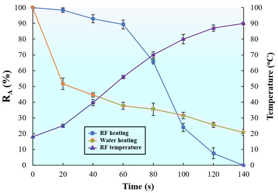 To further confirm the inactivation efficiency of RF, traditional water heating was introduced. Both treatments indicated that relative activity decreased with prolonged heating time (Figure 2). However, the two treatments exhibited different patterns of inactivation efficiency. After RF heating for 140 s, the temperature of the PME solution rapidly increased from 18 °C to 90 °C, and the activity of the PME was fully inactivated. During this process, the relative activity almost did not change within the first 60 s of RF heating, whereas it dropped sharply afterwards when the temperature reached 60 °C. In contrast, the relative activity of the PME solution only decreased to 20.75% after water heating for 140 s at 90 °C, but this decrease was very dramatic in the initial phase and significantly slowed down after 20 s. This might be attributed to the unique composition of PME, which includes both thermolabile and thermostable fractions, where the former is easily inhibited at lower temperatures, but the latter could only be inactivated at higher temperatures []. It was also observed in a previous study that the minimum residual activity of PME reached 18% with conventional heating at 90 °C for 270 s, which indicates that PME is a thermally resistant enzyme []. Another reseaon might be that the components of the medium, such as sugars and salts, can stabilize the enzymatic structure and thus minimize the effect of exposure to heat [].