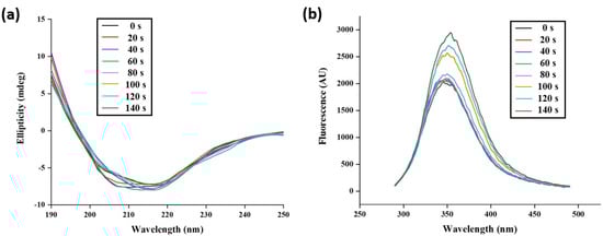 Spectroscopy curves of the PME solution after RF heating treatment. (a) Curve of CD spectroscopy and (b) curve of fluorescence spectroscopy. The electrode gap of the RF system was set as 90 nm. RF heating time was 0 s, 20 s, 40 s, 60 s, 80 s, 100 s, 120 s, and 140 s.