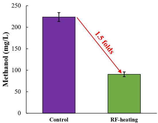 Comparison of methanol contents of the fermentation broth of red jujubes with and without RF heating treatment.