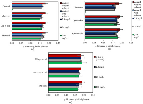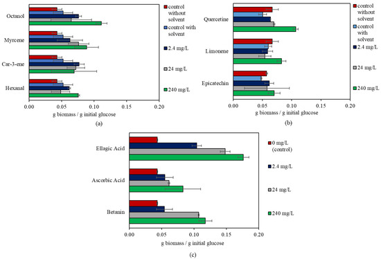 Among the compounds examined, ellagic acid showed the highest effect on R. oligosporus. The biomass yield was enhanced with all concentrations of ellagic acid (2.4, 24, and 240 mg/L) and increased with increasing ellagic acid concentration. The highest biomass yield was four-fold higher than that of the control. Betanin enhanced the biomass yield in the 24–240 mg/L concentration range by 2.5- and 2.7-fold, respectively. Following ellagic acid and betanin, quercetin and octanol increased the biomass yield by 2.1- and 2.2-fold in comparison to their respective control. Limonene, myrcene, hexanal, and ascorbic acid increased the biomass yield in the range of 38–92% at the 240 mg/L concentration in comparison to their respective controls. Epicatechin and car-3-ene were the only compounds that did not cause any change in the biomass yield of R. oligosporus. The changes in biomass yield for R. oligosporus are shown in Figure 1.