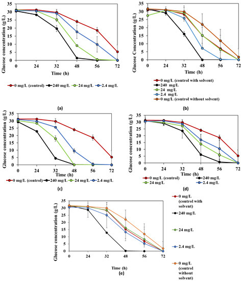 Changes in the glucose consumption trend of R. oligosporus during cultivation in the presence of bioactive compounds: (a) betanin, (b) octanol, (c) ellagic acid, (d) ascorbic acid, and (e) hexanal.