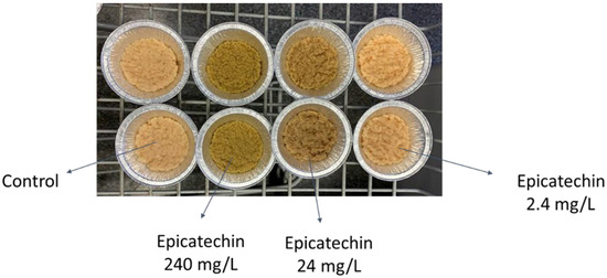 The bioactive compounds—except limonene and octanol—did not affect the biomass yield significantly, possibly indicating that the fungi did not consume them. However, the adsorption of some phenolic compounds onto the fungal biomass was observed visually. Figure 4 shows the fungal biomass obtained from the cultivation media containing epicatechin. The pictures were taken after the biomass was washed with milli-Q® water. The fungus shows potential for color removal from fruit industry waste; however, it should be further investigated for efficiency. Nweke et al. [63] stated that dead fungi showed better potential for biosorption in comparison to live fungi. Hence, it might be interesting to investigate the adsorption potential of the dead biomass of N. intermedia further for the enrichment of edible biomass with phenolic content from fruit processing side-streams.