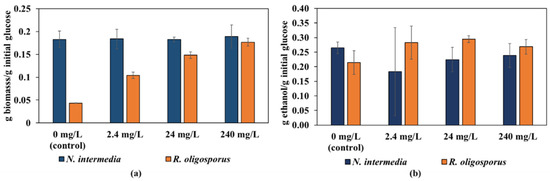 Comparison of R. oligosporus and N. intermedia in the presence of ellagic acid: (a) biomass yields and (b) ethanol yields.