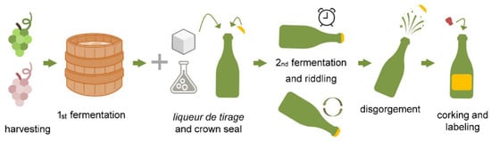 After the meticulous harvesting of the grapes with the desired specific maturing stage and their pressing, the process proceeds with the sulphitation of the must (to avoid the triggering of spontaneous fermentations), clarification with pectolytic enzymes, and inoculation of S. cerevisiae starter cultures; the latter reduces the sugars present into ethanol and CO2. The grape must ferments to produce a base wine with reduced alcohol content. Sparkling wines can be produced after a refermentation (secondary fermentation) in bottles (traditional method or Champenoise method) or in an autoclave (Charmat method). For the traditional, classic, or Champenoise method in the secondary fermentation, the liqueur de tirage is added to the base wine; it is a mixture of sucrose, adjuvants, and yeasts, such as Saccharomyces cerevisiae or Saccharomyces bayanus, a hybrid between S. uvarum and S. cerevisiae [1,12] (Figure 1).