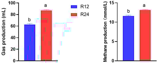 The production of total gas and methane as fermentation process advanced is shown in Figure 1. Both the total gas production and methane production in R24 were higher than that in R12 (both were p < 0.001), increased by 39.03% and 13.04% for total gas and methane production, respectively.