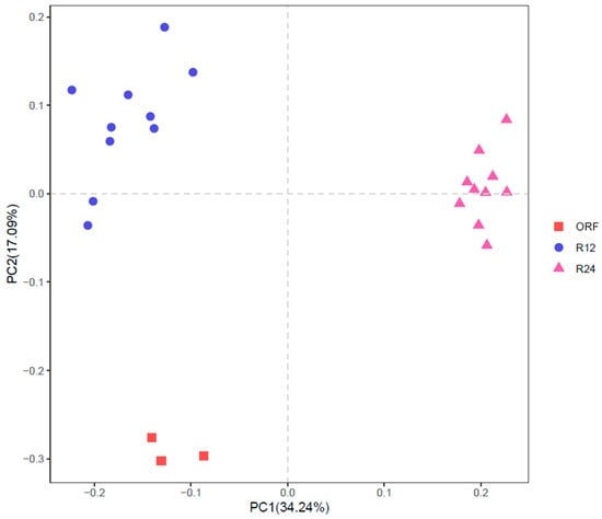 Principal component analysis (PCA) of rumen bacterial communities based on Euclidean distances. ORF, original rumen fluid; R12, in vitro rumen fermentation at 12 h; R24, in vitro rumen fermentation at 24 h.