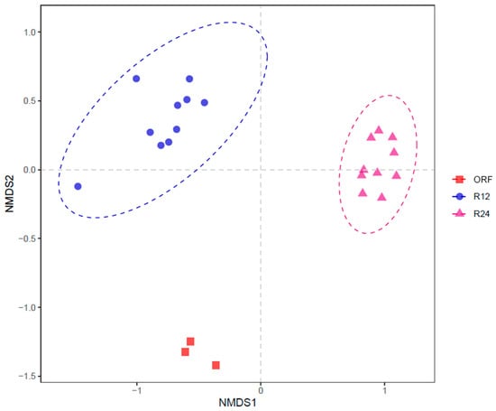 Non-metric multidimensional scaling (NMDS) of rumen bacterial communities based on Bray–Curtis distances. ORF, original rumen fluid; R12, in vitro rumen fermentation at 12 h; R24, in vitro rumen fermentation at 24 h.