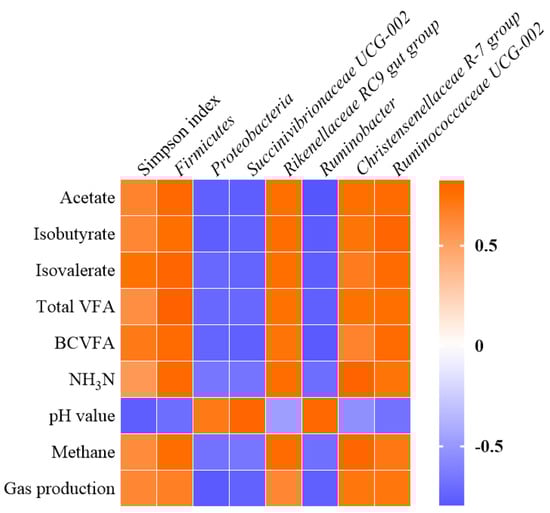 Correlations between gas production, rumen fermentation characteristics, and rumen bacterial community. VFA, volatile fatty acids; BCVFA, branched-chain volatile fatty acids; NH3-N, ammonia nitrogen; only significant correlations (r > 0.70 or r < −0.70 and q < 0.05) and bacteria with average relative abundances > 0.5% are shown. The colors indicate positive (red, closer to 1) or negative (blue, closer to −1).
