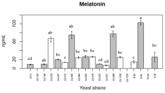 - Rodriguez-Naranjo, M.I.; Gil-Izquierdo, A.; Troncoso, A.M.; Cantos-Villar, E.; Garcia-Parrilla, M.C. Melatonin Is Synthesised by Yeast during Alcoholic Fermentation in Wines. Food Chem. 2011, 126, 1608–1613. [Google Scholar] [CrossRef]