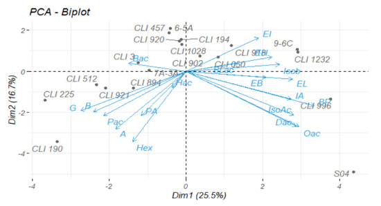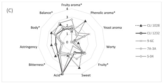 3.3. Aromatic Profiles in 100 mL Fermentations