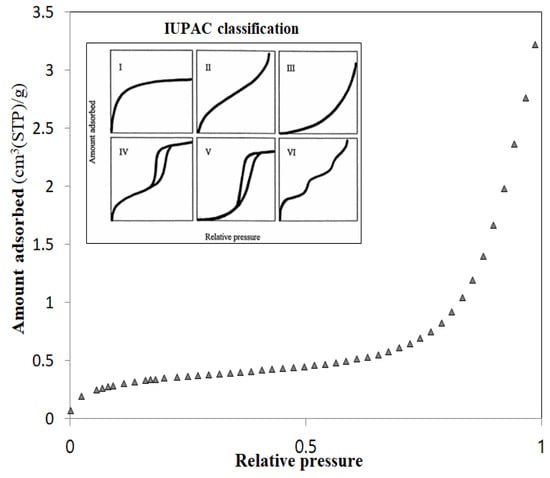 The BET analysis of the biochar indicated that the surface area was 1.2969 m2·g−1, the total pore volume was 0.004982 cm3·g−1, the adsorption average pore width was 153.6522 nm, and the adsorption average pore diameter was 179.996 nm. The graph of nitrogen isothermal adsorption (Figure 1) suggests Type II, according to the IUPAC classification [41]. According to Rouquerol et al. [42], biochar with such characteristics has mesopores, indicating that abundant pores were formed inside the biochar. As Yue [17] reported, the insides of the pores provide a beneficial environment for microbial growth [43,44].