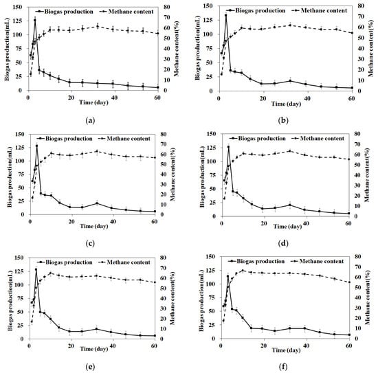Methane content by condition (biochar content); (a) control 0%, (b) 0.1%, (c) 0.5%, (d) 1.0%, (e) 3.0%, (f) 5.0%.