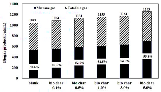 All conditions recorded the maximum volume of gas generation on day 4, which gradually decreased thereafter. The maximum volume of gas was higher in the added-biochar conditions than in the control condition. The less the biochar, the greater the maximum volume of gas generated on day 4 (133 mL at 0.1% biochar compared with 114 mL at 5.0%). In terms of the total amount of biogas generated during the period (Figure 3), however, increasing the amount of biochar increased the gas production (control condition: 1049 mL, 0.1%: 1084 mL, 0.5%: 1131 mL, 1.0%: 1155 mL, 3.0%: 1164 mL, and 5.0%: 1253 mL).