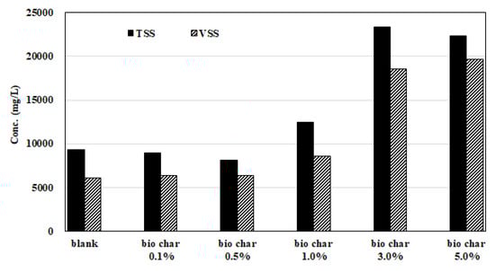 Total suspended solids (TSS) and VSS before and after the BMP test were analyzed to examine sludge reduction in the digestion reaction. TSS and VSS after the BMP test were analyzed including biochar (Figure 4). Both TSS and VSS decreased in biochar in the various conditions up to 0.5% and increased rapidly when 3% biochar was added. The VSS was lower than the initial value of 9020 mg·L−1 when less than 3% biochar was added; however, it increased with more than 3% biochar. These results are opposite to the typical AD digestion reaction, in which the decomposition of organic matter increases with gas production, and thus the VSS decreases. Biochar is reported to serve as a medium when it is added to the digestion tank [47], and according to Montalvo [48], the population of microorganisms increases when zeolite, which plays the role of medium, is put into the digestion tank.