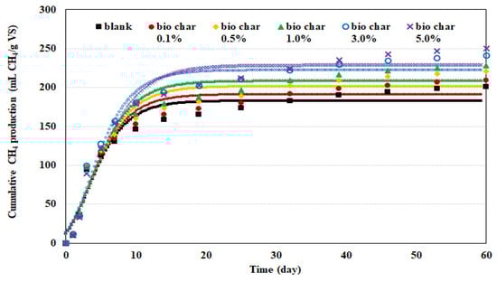 Applying the cumulative production curves of methane gas obtained from the BMP test to the modified Gompertz model for optimization showed that R2 was 0.95 or higher (maximum 0.9673), indicating that the results of the BMP test on methane production with organic waste were correctly simulated (Figure 6). Accordingly, the methane potential (the volume of methane produced) increased as biochar was added (182.8, 191.2, 201.9, 209.1, 222.3, and 228.8 mL CH4·g−1 VS), and the highest methane production rates were 21.5, 21.8, 22.1, 22.8, 25.0, and 22.5 mL CH4·g−1 g VS per day. Based on the methane potential and the highest methane production rates, 3% biochar achieved the highest efficiency. The rates increased up to 3% biochar but decreased at 5%, which can be attributed to the decrease in microbial activity due to the increased addition of biochar [44].