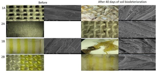 The soil was collected from lakeside area Ceatalchioi (soil #1) and forest Bididia-Mineri (soil #2) from Tulcea—Romania, and had a particle size of 0.5–1 cm, 50–55% content of dry substances, and pH in the range of 4.0 to 7.5. The biodegradation was done by burying the samples in the soil according to the ISO 11721-1:2001 [